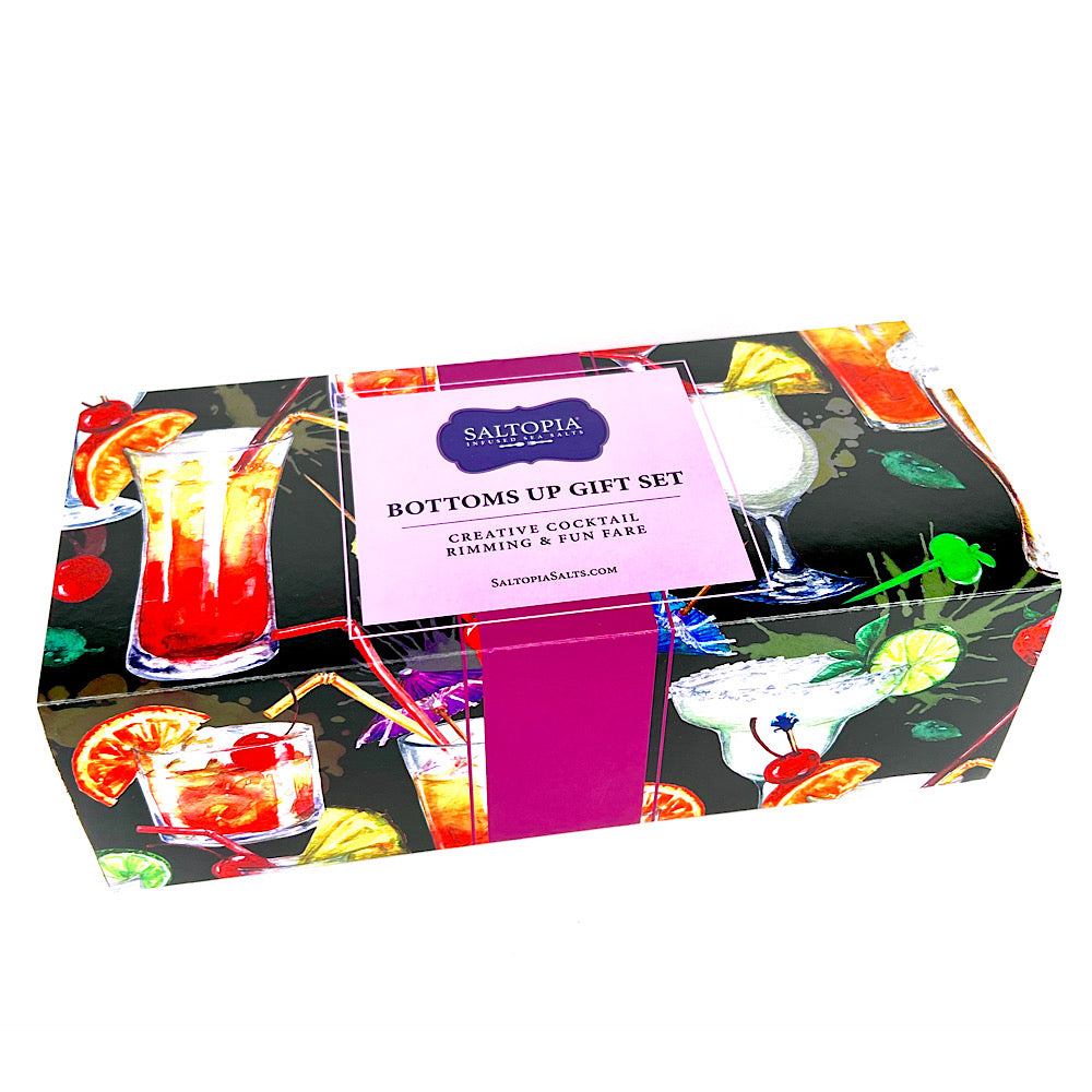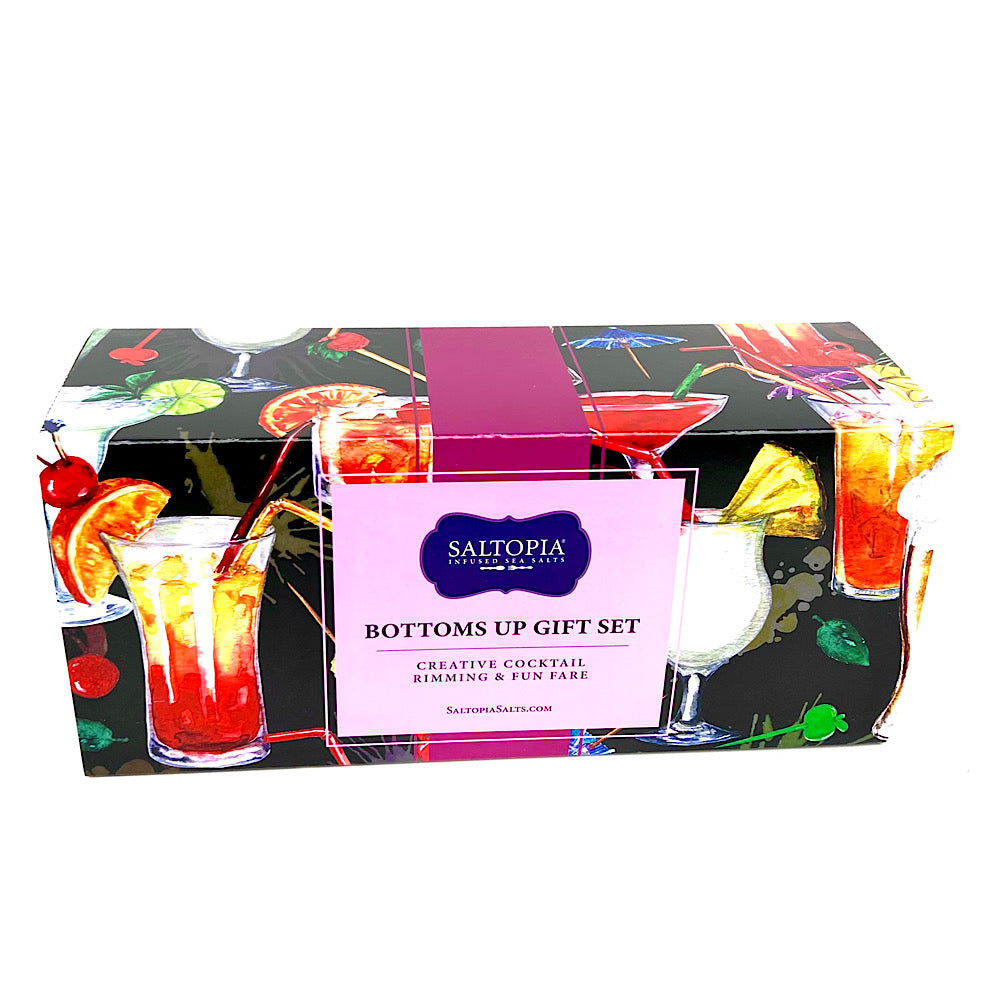 Whether the bar is open or it’s “last call” SALTOPIA’s BOTTOMS UP gift set offers 5 perfectly balanced flavors such as vanilla bean, maple, caramel, lemon and a savory coconut brilliant for cocktail rimming, as well as snacking on the side! Set includes five flavors and we also included a recipe card offering cocktail recipes and ideas for enjoying this set! The set is beautifully packaged in ready to gift boxes with a corresponding themed wrap/sleeve making the set extra special! Our products are 100% pure and made in the USA. Shelf life is 3 years from the date of the receipt. Store cool & dry.